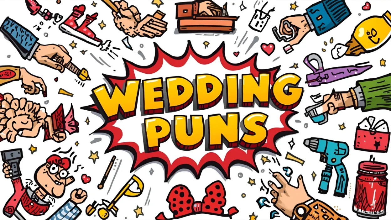 From bride and groom jokes to cake humor, bouquet laughs, ring wordplay, reception fun, and caption-ready quips, this list of 670+ wedding puns ties humor into every detail.